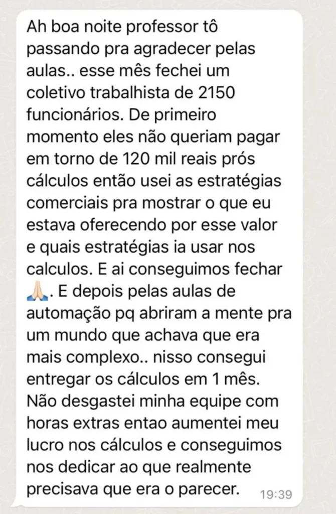 Isso depende do seu ritmo, mas a média dos nossos alunos é de 30 a 90 dias para fechar os primeiros cálculos com segurança. A diferença é que você não fica travado sozinho terá suporte, modelos prontos e ferramentas que encurtam meses (ou anos) de tentativa e erro.